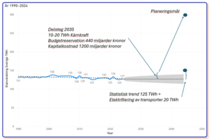 Regeringen styr mot ett planeringsmål på 300 TWh elanvändning. Det ligger långt över hur Sverige faktiskt har använt el under lång tid och riskerar att låsa in 60–80 års kapitalkostnader i elnät och produktion. Samtidigt har Sverige i dag ett tydligt nettoöverskott av el. Innan staten gör långa bindande åtaganden behöver kostnader, risker och alternativ redovisas öppet.