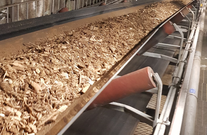 Bild: Bioenergi i form av flis på väg till förbränning och värmeproduktion.